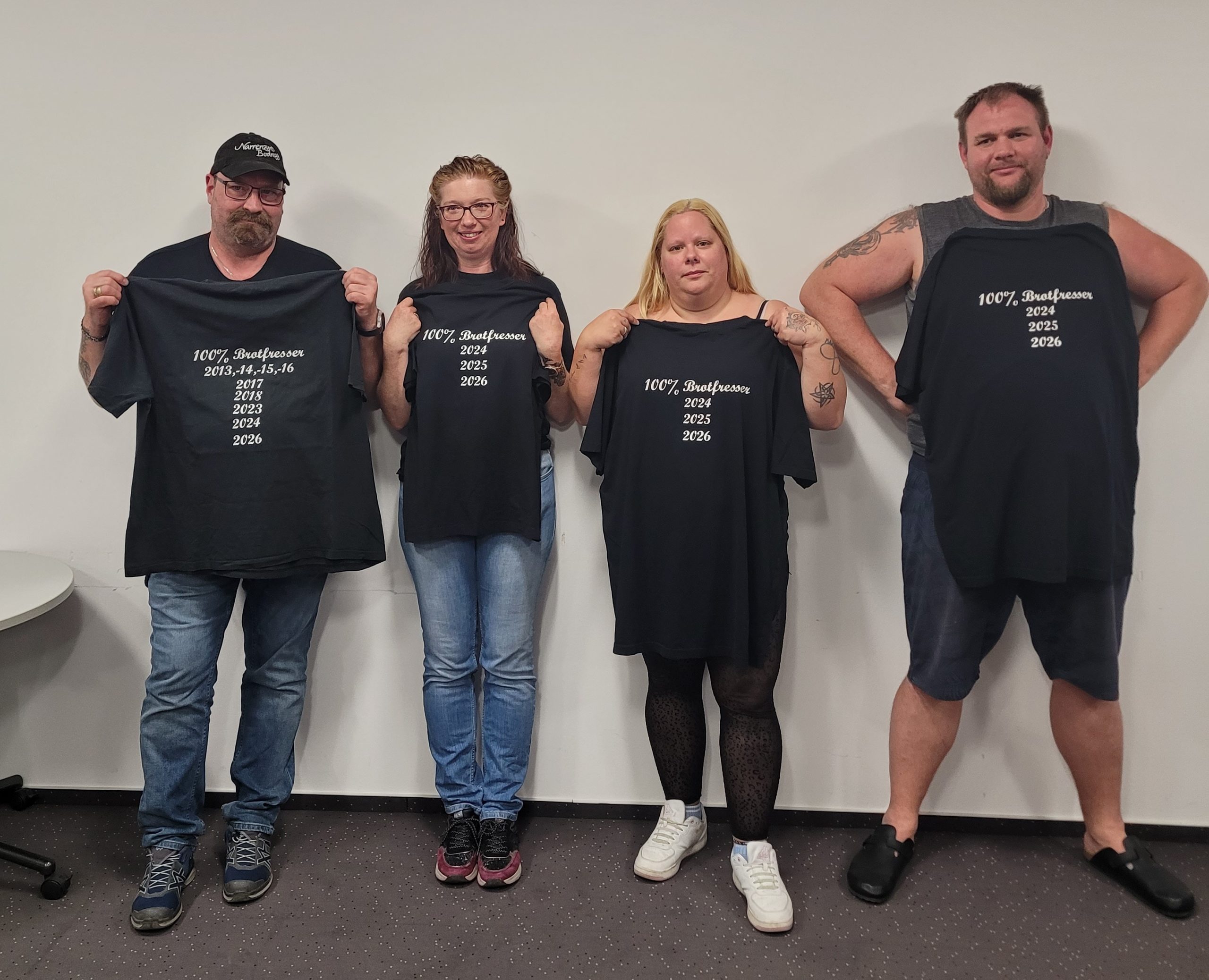 Als gelungener Abschluss folgten die Ehrungen der diesjährigen 100-Prozent-Springer. Angela Schreibmüller, Patrick Dreher, Yvonne Dreher, Tanja Groß und Thomas Fetscher waren bei jedem Narrensprung und jeder Veranstaltung der Fasnet 2026 dabei. Für diese tolle Leistung erhielten die fünf Mitglieder als Geschenk jeweils ein extra angefertigtes Zunft-T-Shirt.